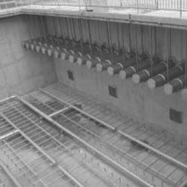在没有曝气管路时(比如缺氧反应池),还继续使用垂直固定的平板网。此时,沿着板的底部设气流喷射装置,可以对筛网进行周期性脉冲以去除积聚在网上的杂物。